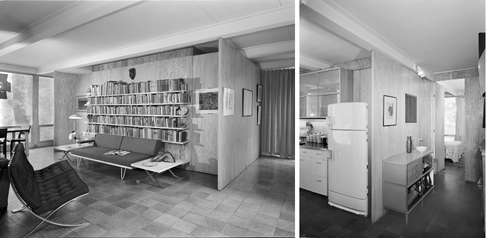 The house consists of two wings – one intended for the parents and the other for the children. Glass exterior walls and steel partitions, as opposed to mortar walls and conventional windows, were hallmarks of Mies van der Rohe’s designs. Both wings lack traditional interior walls between rooms. Mechanical services, bathrooms, a galley kitchen and heaters were arranged compactly into a central core surrounded by movable wooden panels.