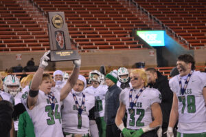 York’s Joseph Reiff, right, smiles as teammate Jimmy Connors lifts the state second-place state trophy in November.