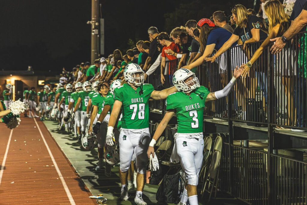 Joseph Reiff (78) and his teammates high-five York fans during an early-season game in 2024. Photo courtesy of York High